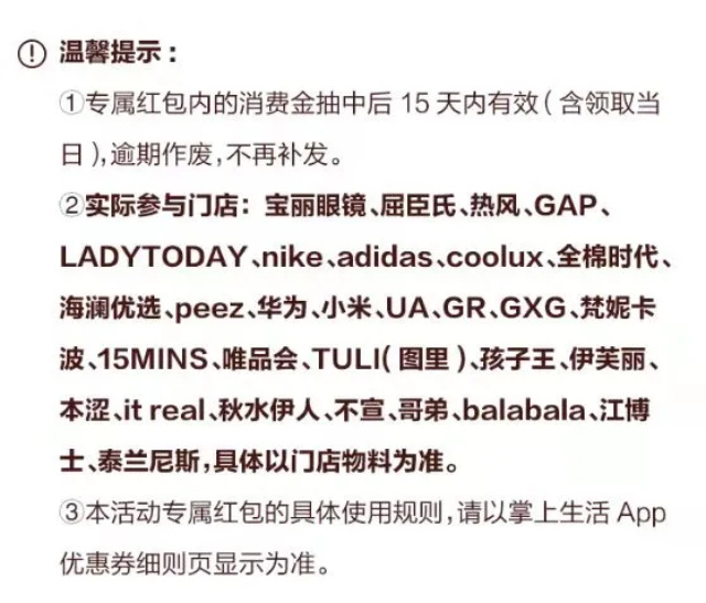 以“掌上生活”APP优惠券券细则页为准!